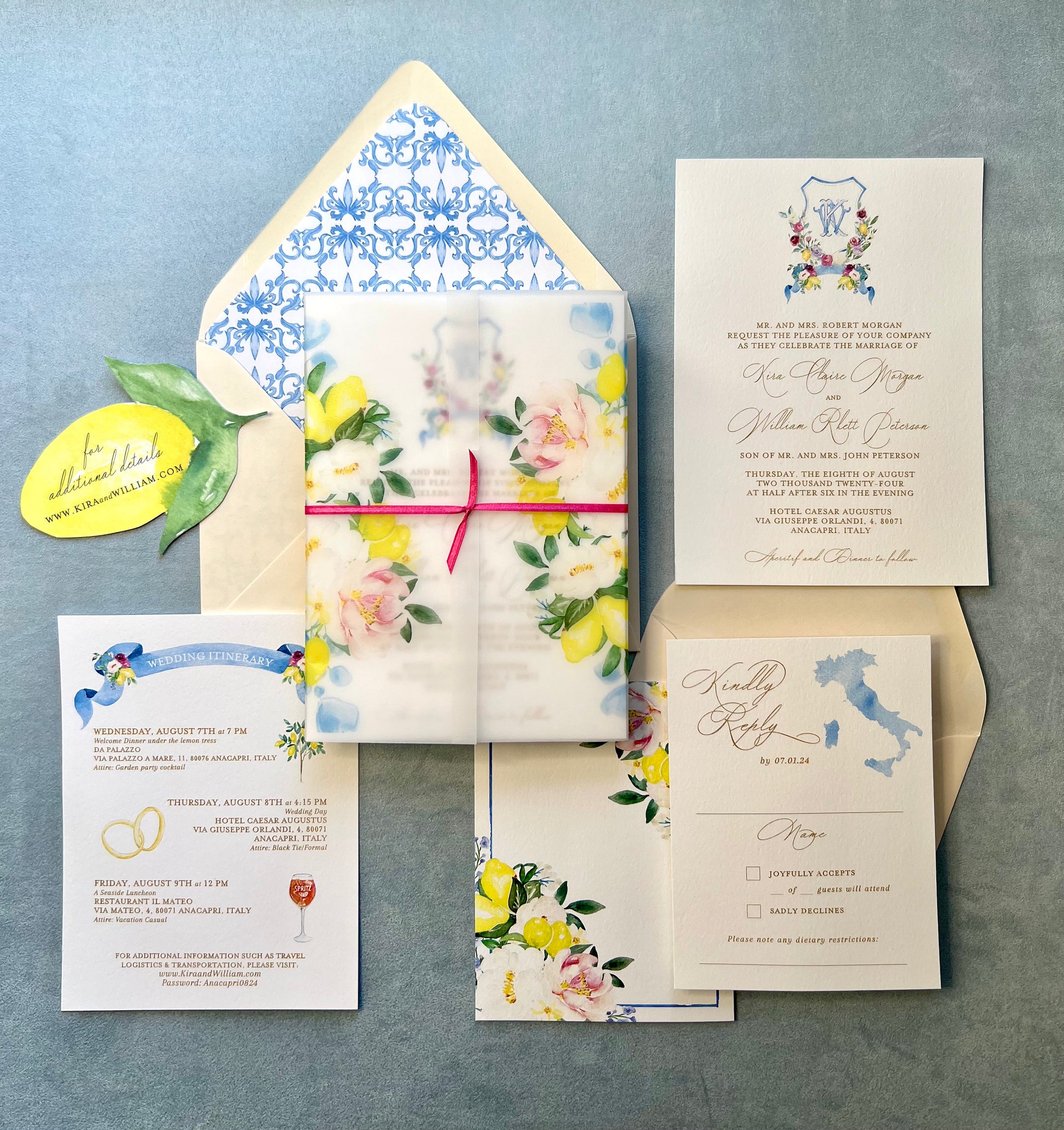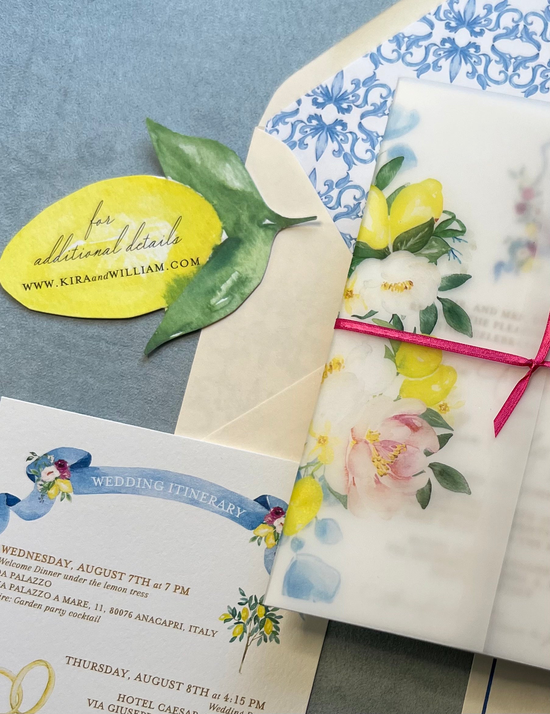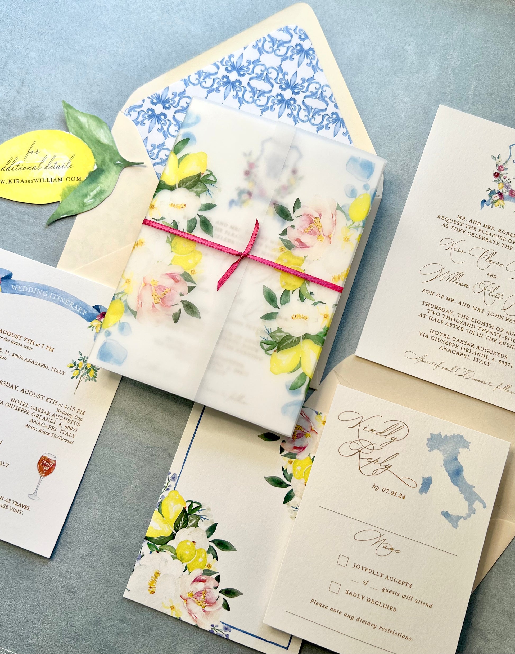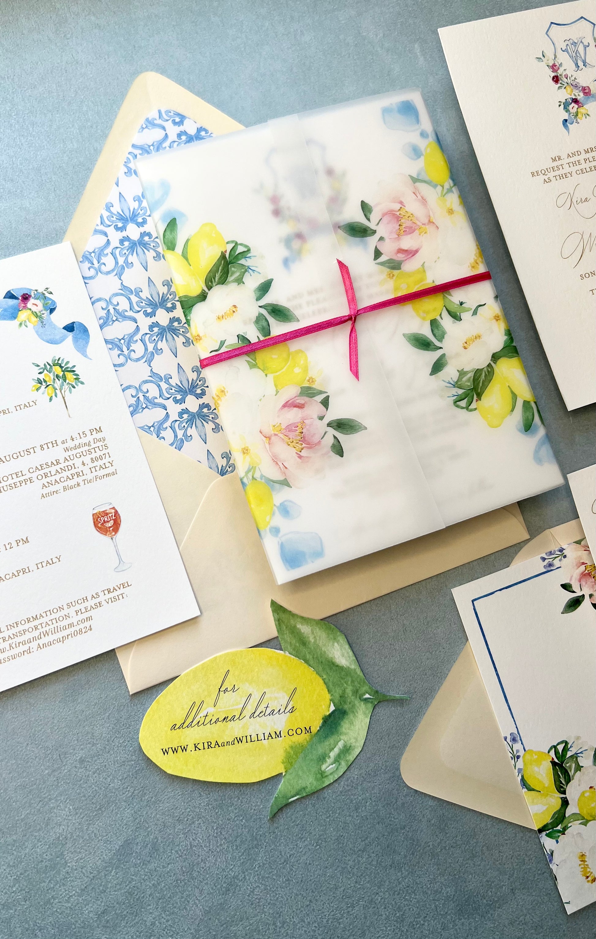 Our Amalfi Coast Vellum Wraps, Patterned Envelopes and Lemon Details Cards can all be ordered a la carte if you aren't needing the full suite. Search "Amalfi Coast" in our shop to see all the options.