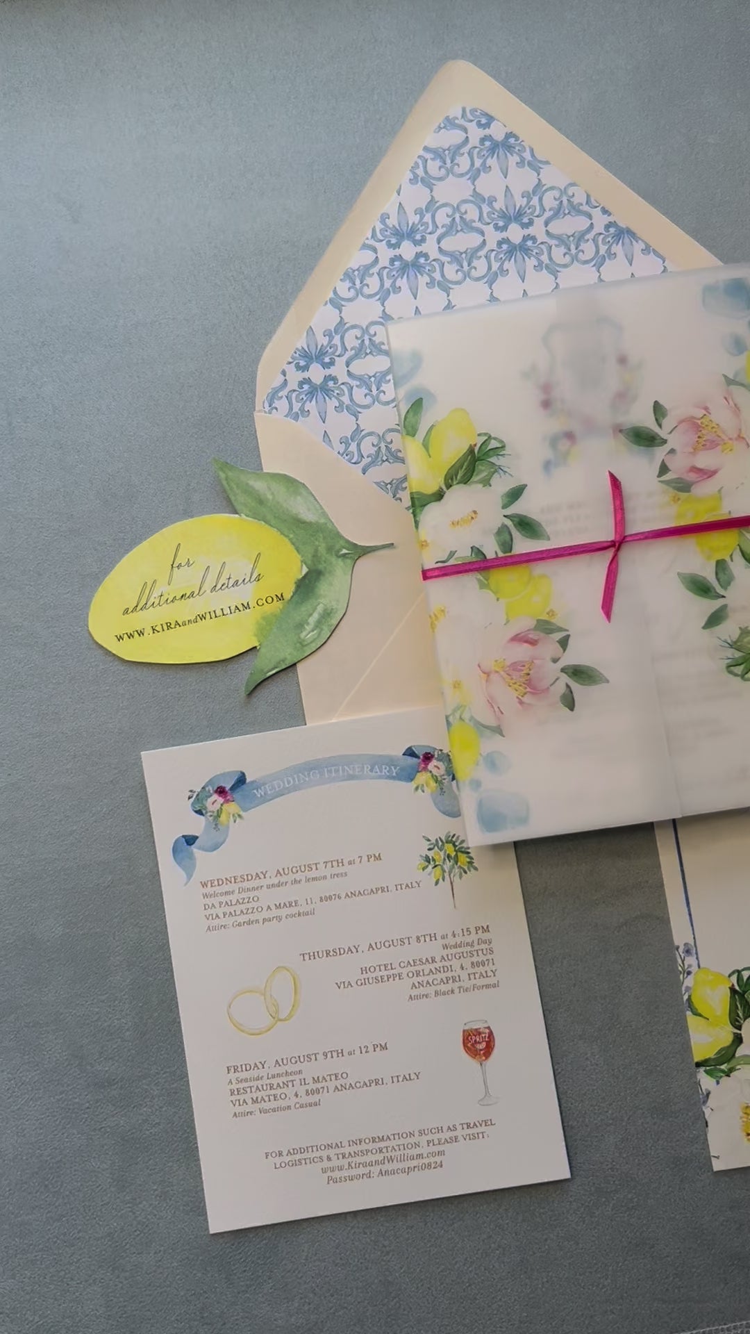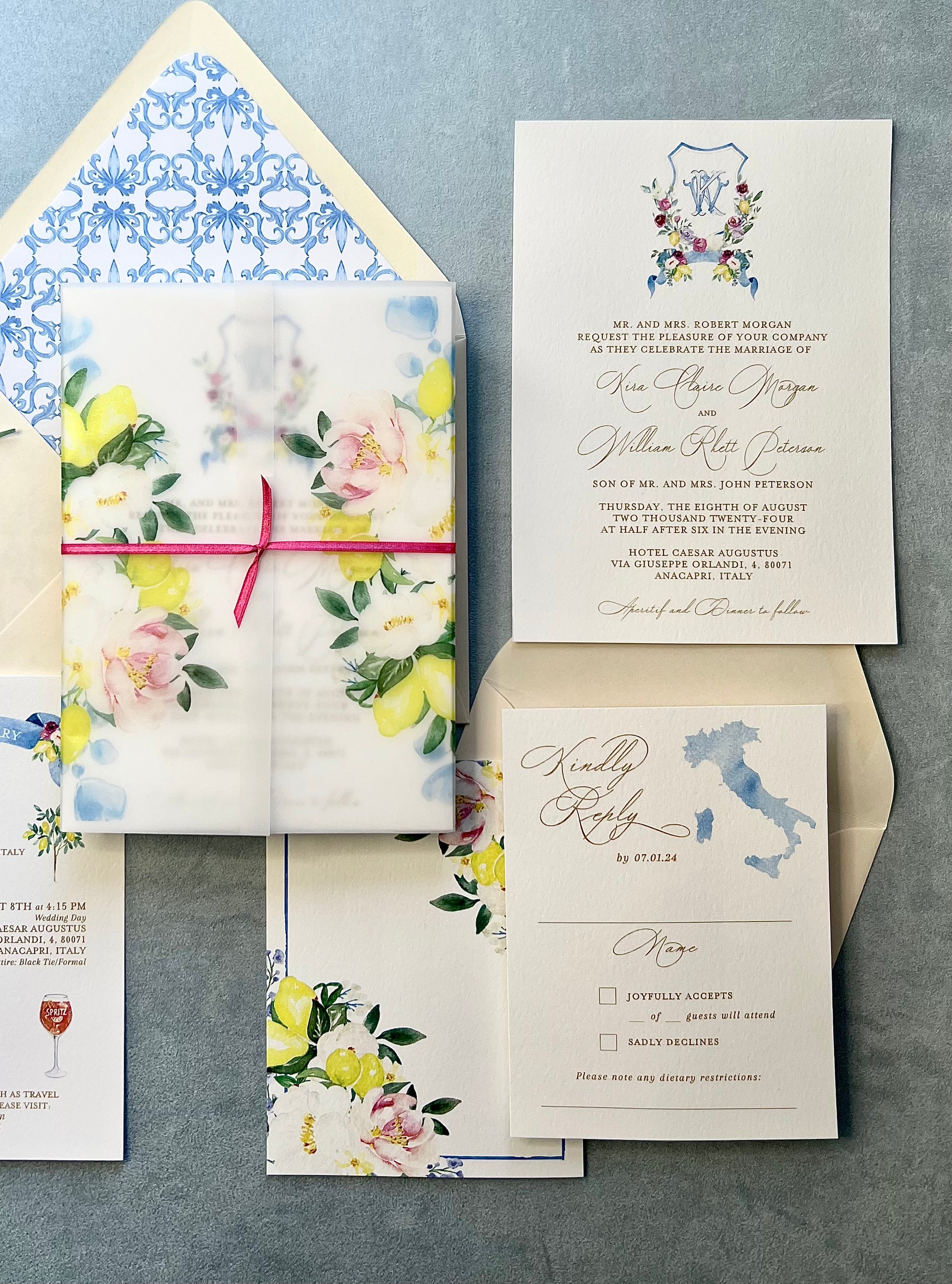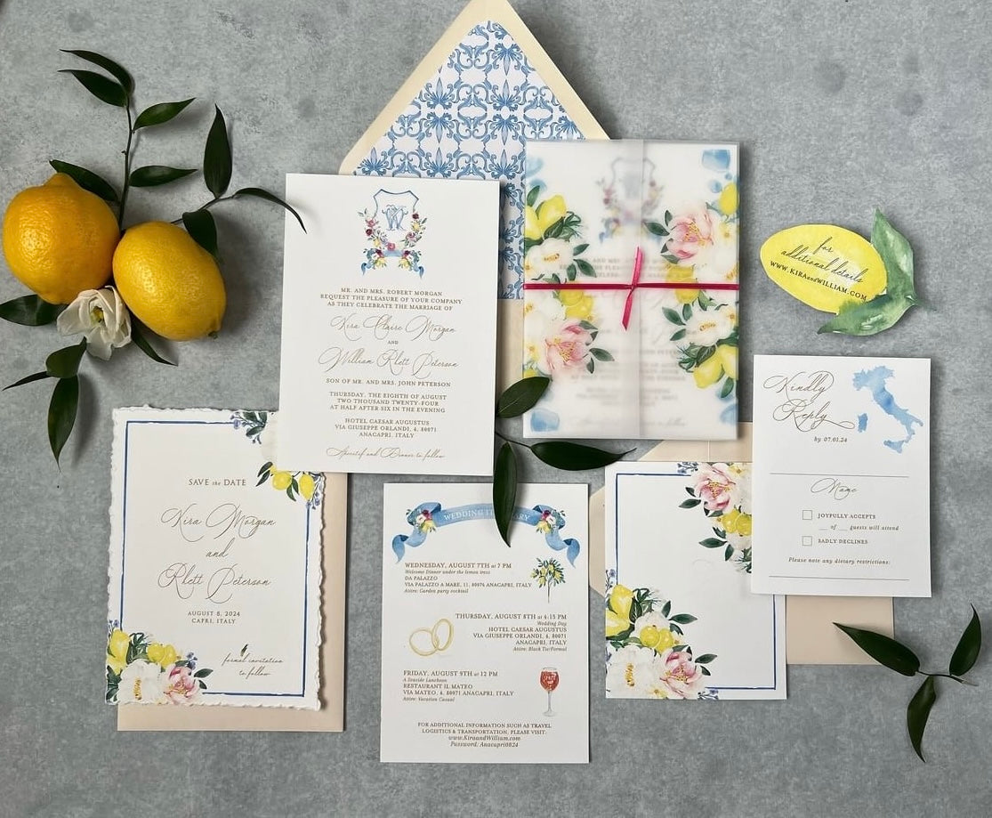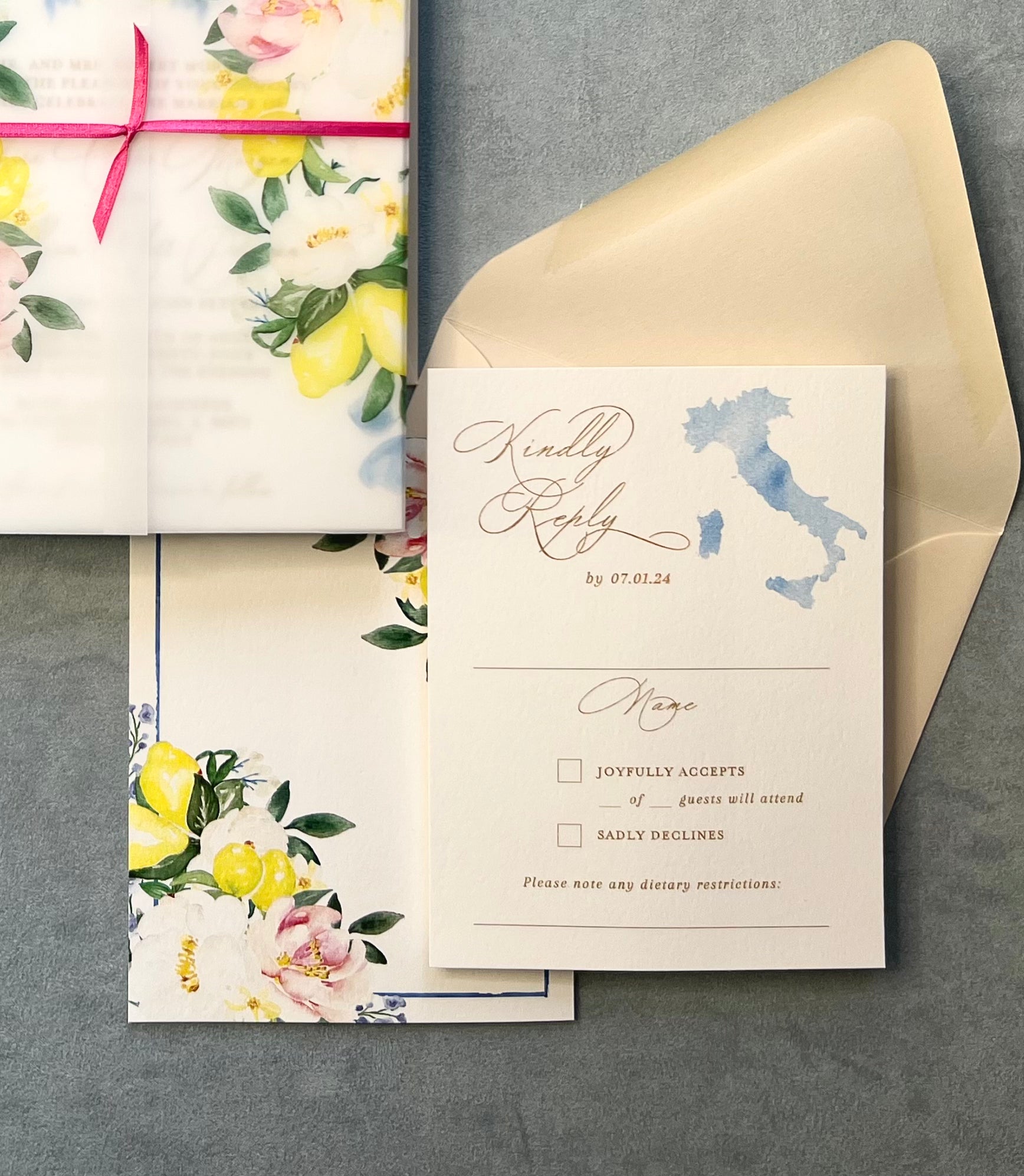 Our Amalfi Coast Vellum Wraps, Patterned Envelopes and Lemon Details Cards can all be ordered a la carte if you aren't needing the full suite. Search "Amalfi Coast" in our shop to see all the options.