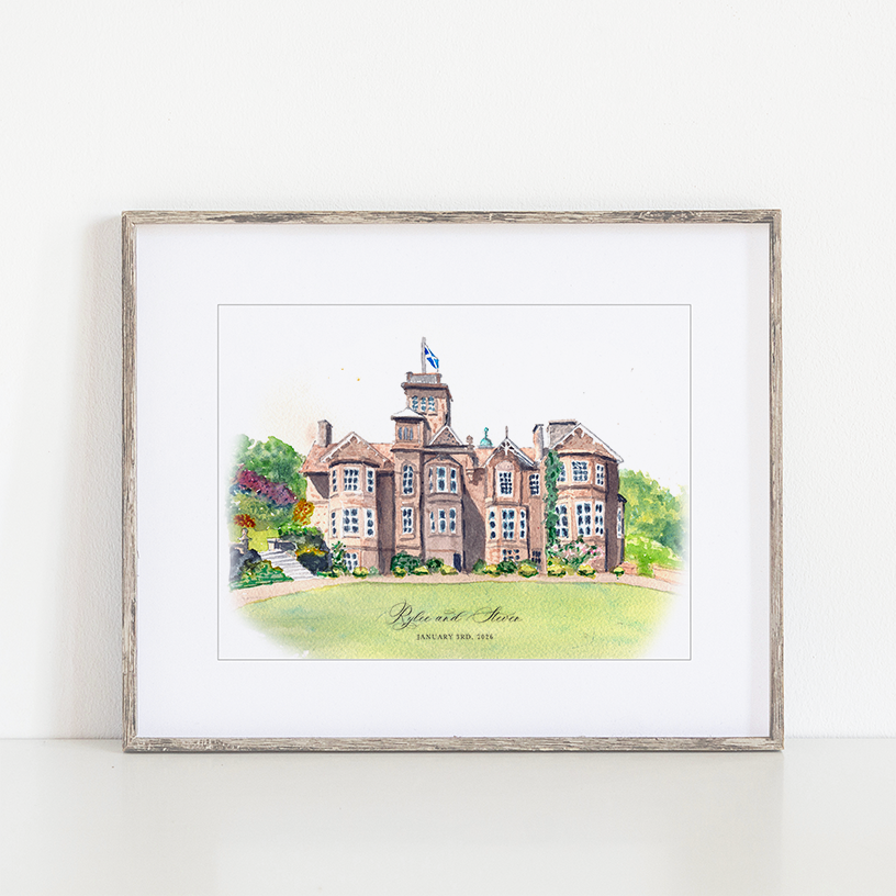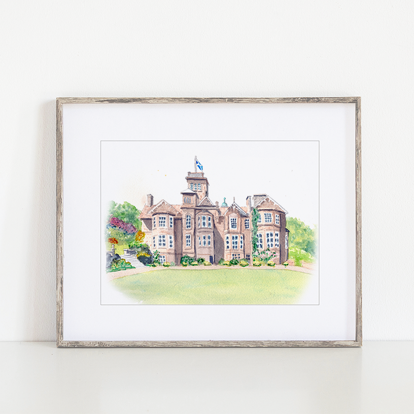 This is an art print of our hand-painted watercolor portrait of Auchen Castle, in Beatlock, Moffat, Scotland