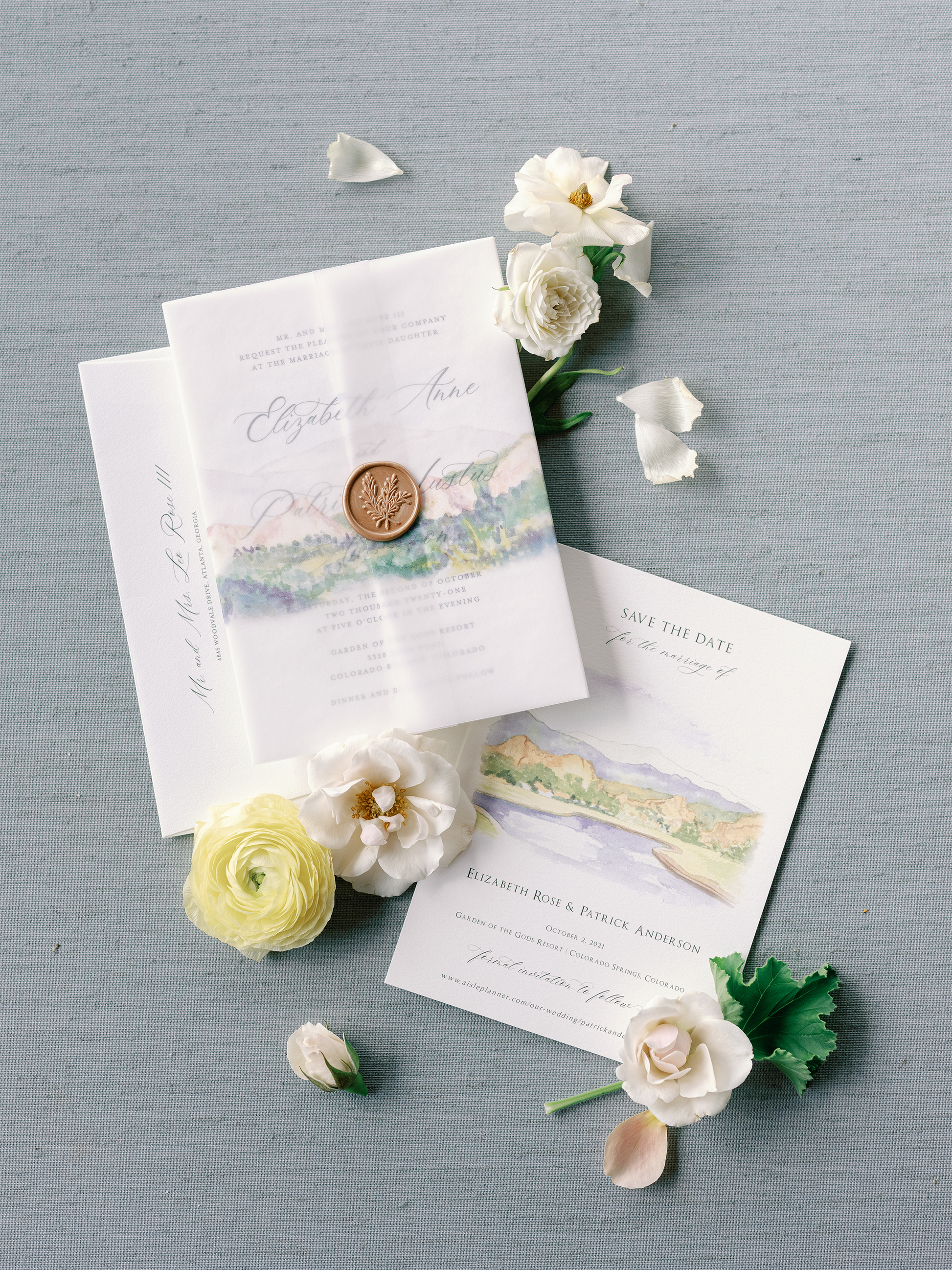 Perfect for any wedding in the mountains, this vellum wrap features the mountains of Colorado Springs. It is 10.5" by 7 in size, printed on 29# translucent vellum. The wraps will arrive to you flat, for you to wrap around your invitation suites.