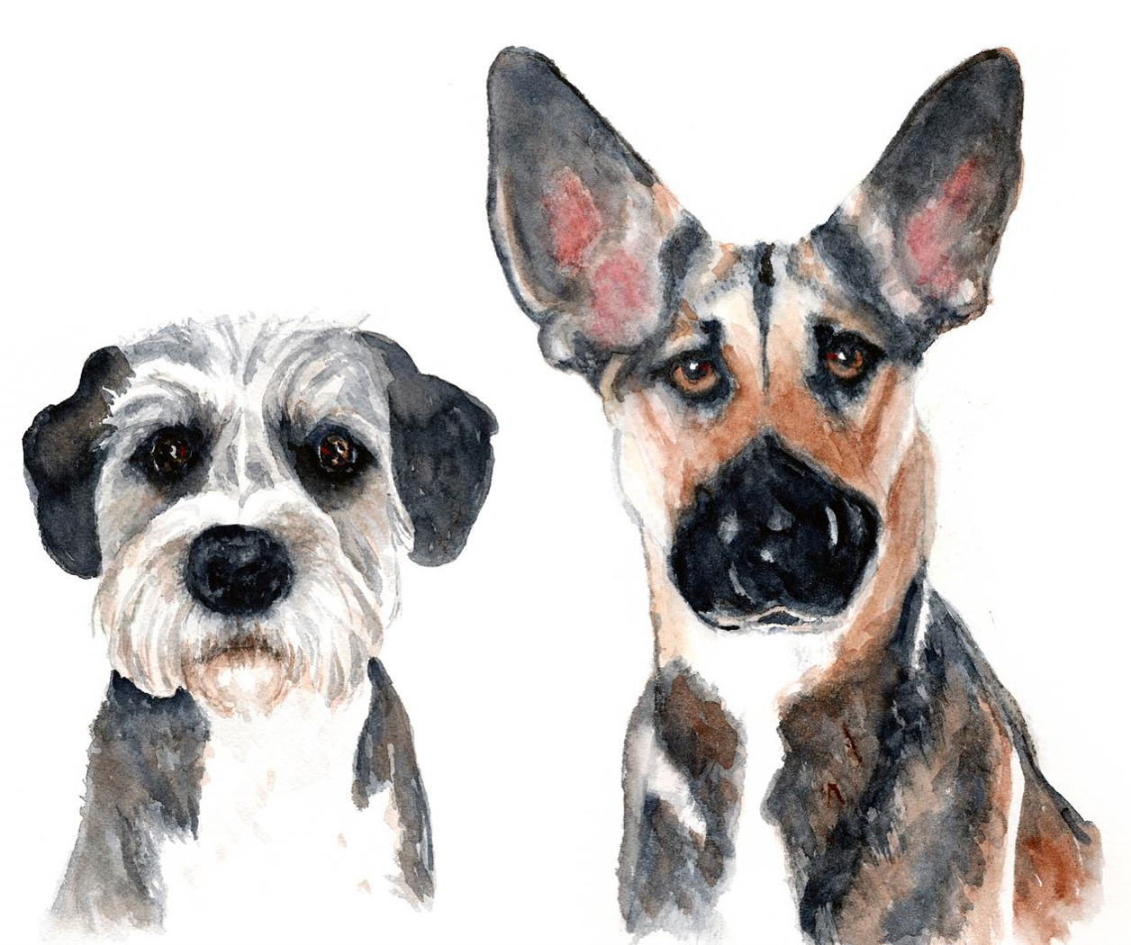 We can include two dogs in one painting. The dogs will have to be smaller to fit two onto one 8x10" page, so please note that there will be a bit less detail in each animal. The cost for 2 dogs in one portrait is $425.