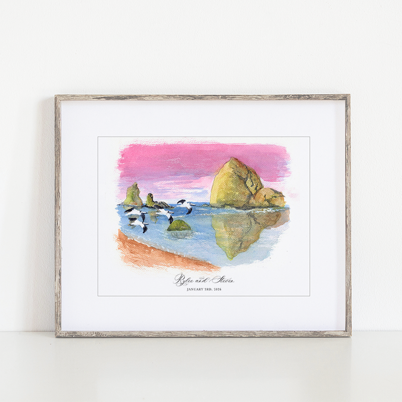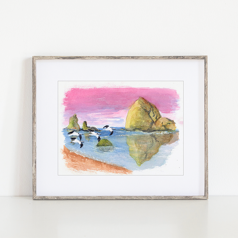 This is an art print of our hand-painted watercolor portrait of Haystack Beach, Oregon