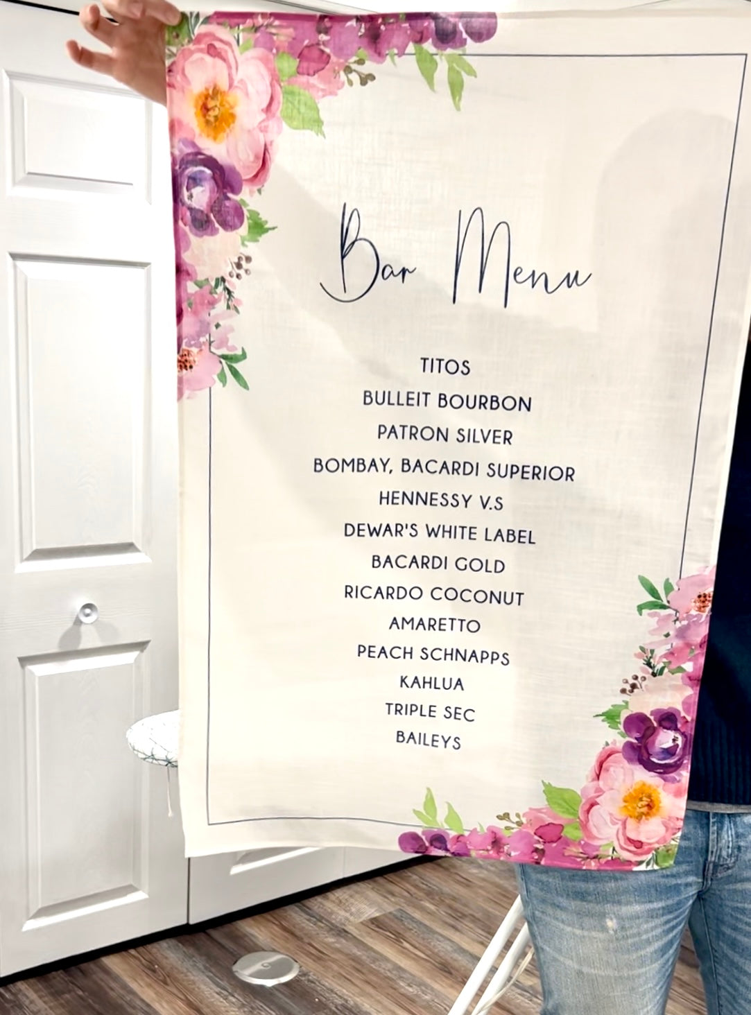 This is a linen sign, which can be used as a welcome sign, bar menu or signature drink sgin. We can use your venue watercolor or monogram that we have already painted for your or if we haven't already created art and you want to include it, you can add that from our "Custom Art" section of our website.