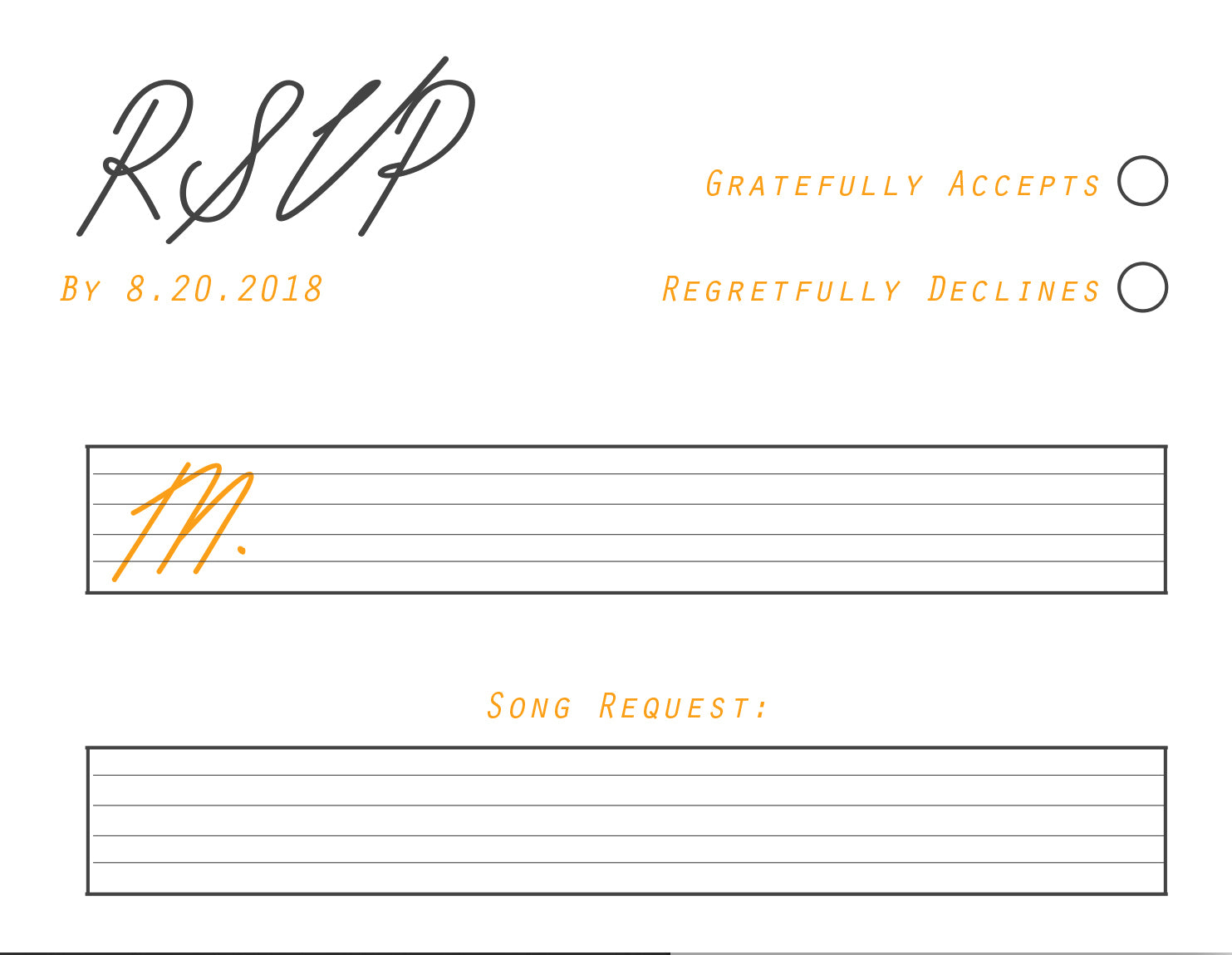 1 - 4.25" by 5.5" flat double-sided RSVP card with straight edges in White or Soft Ivory 120# Eggshell stock.