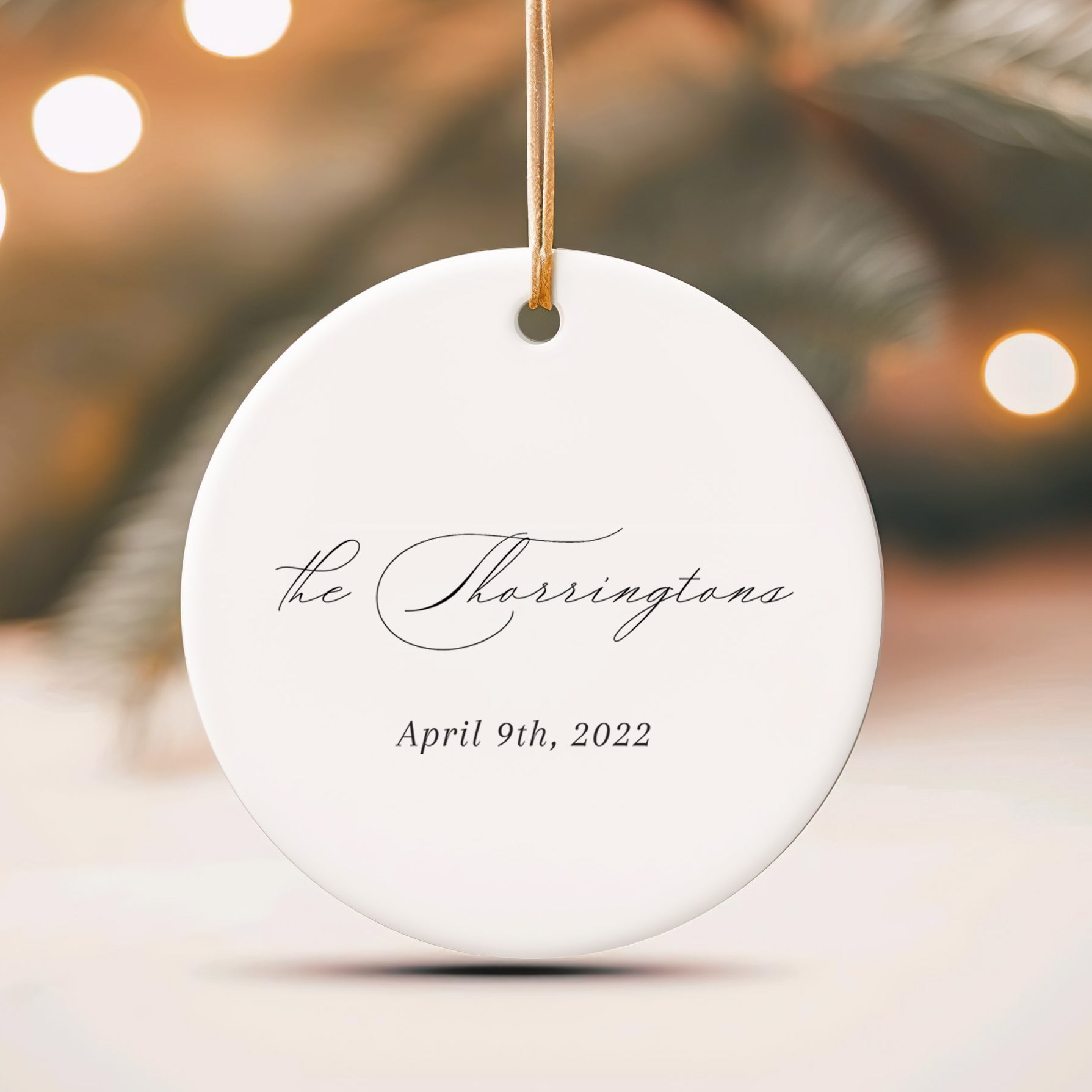 Celebrate the Newlyweds this year with a personalized watercolor ceramic Christmas ornament.