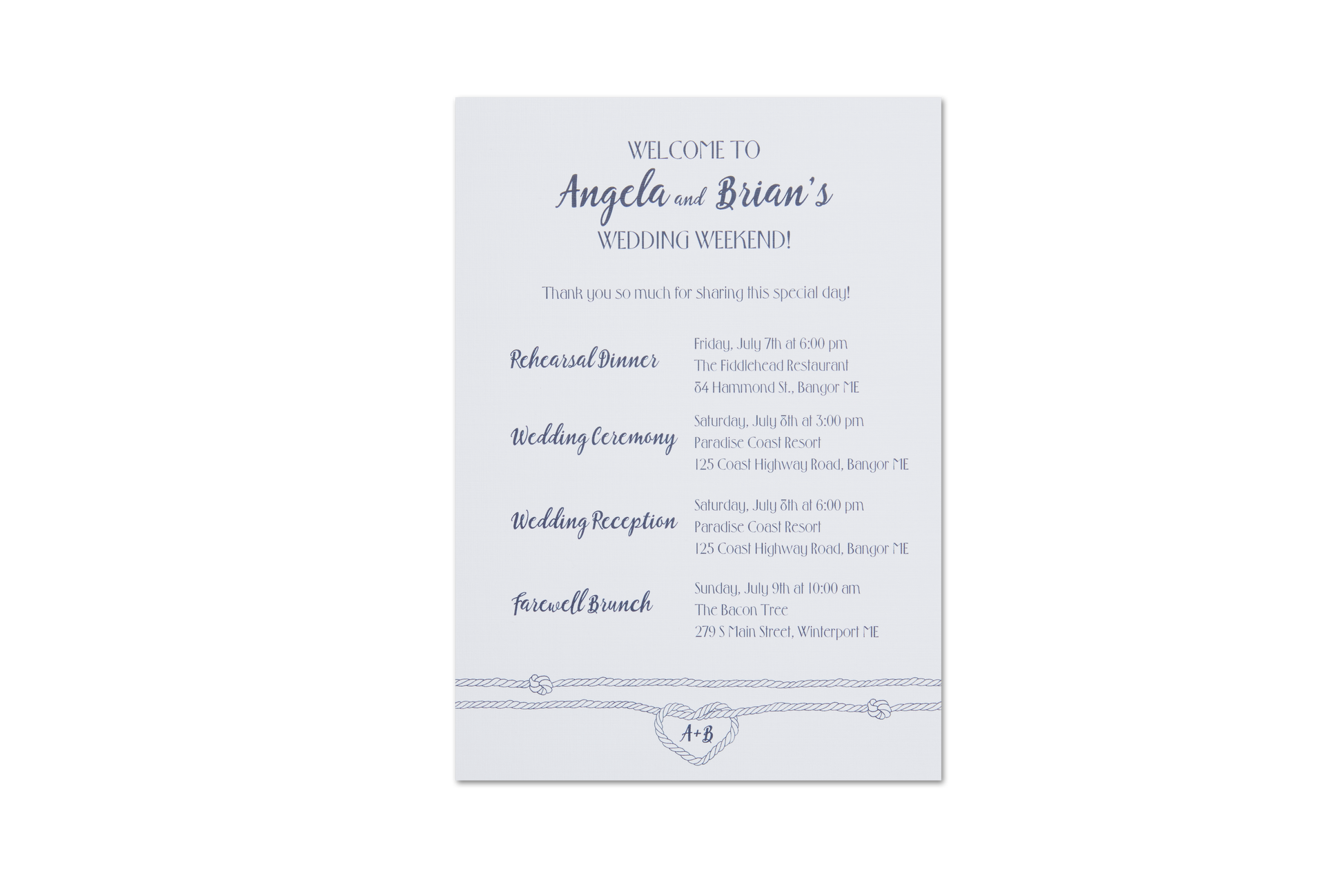 Size: 5x7" flat single-sided itinerary card with straight edges, on our Signature White or Soft Ivory 120# Eggshell stock.