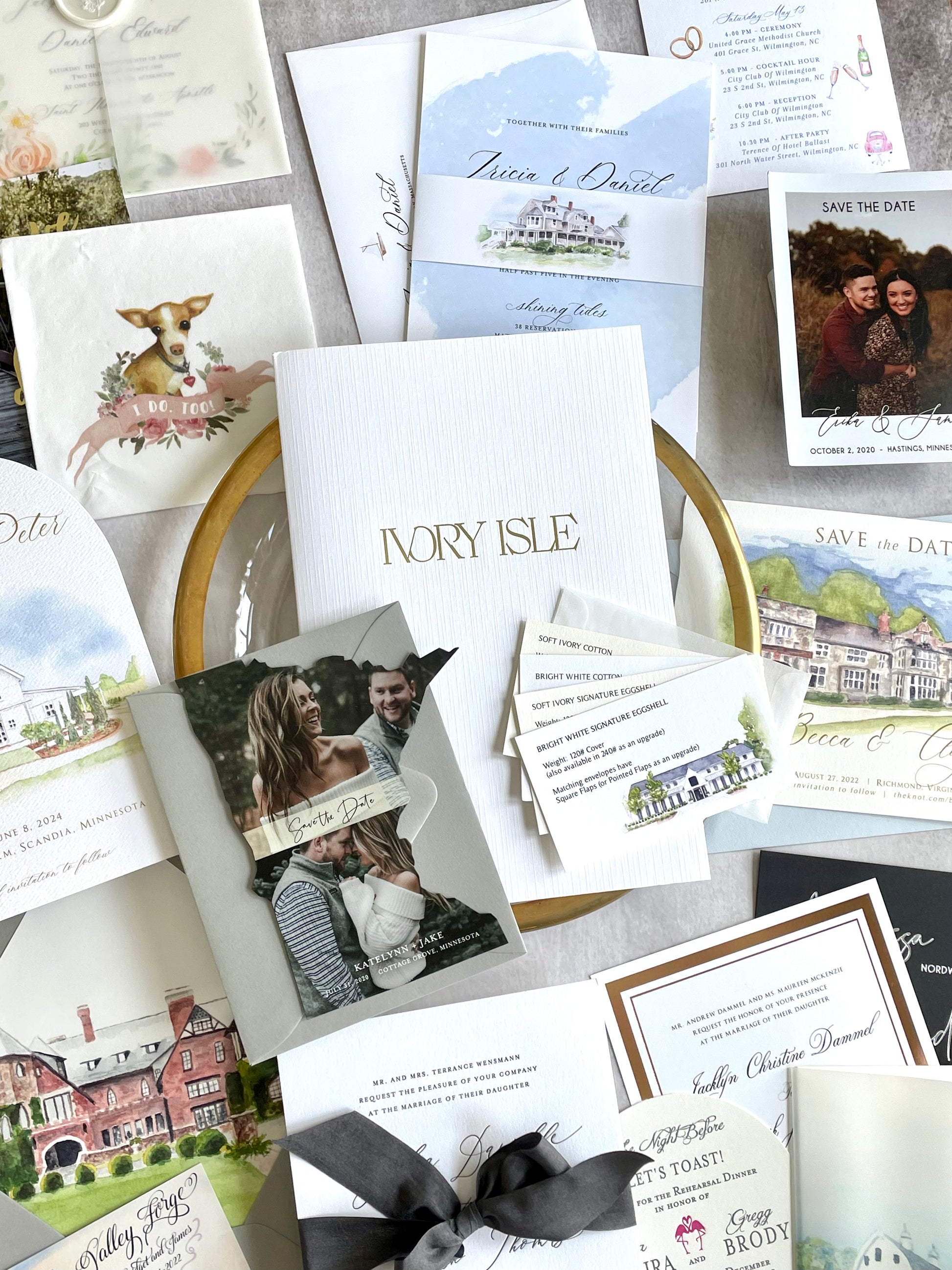 Sample pack of various Save the Dates and Wedding Invitation Suites, so you can get a feel for our material and production quality before placing an order.