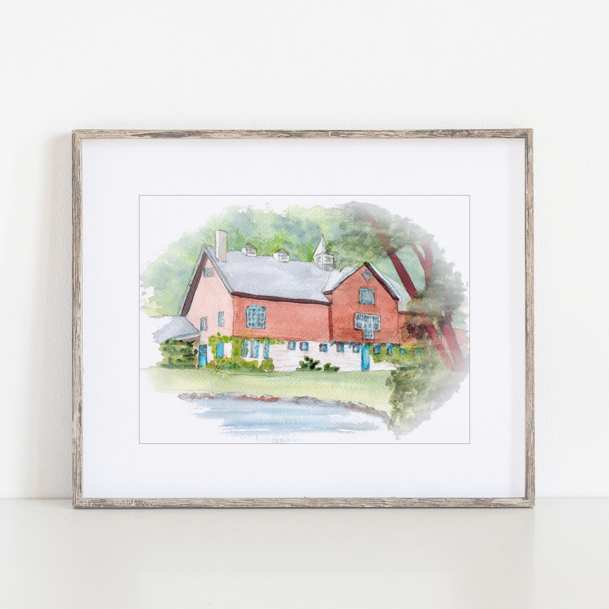 This is an art print of our hand-painted watercolor portrait of Stonover Farm in Lennox, Massachusetts