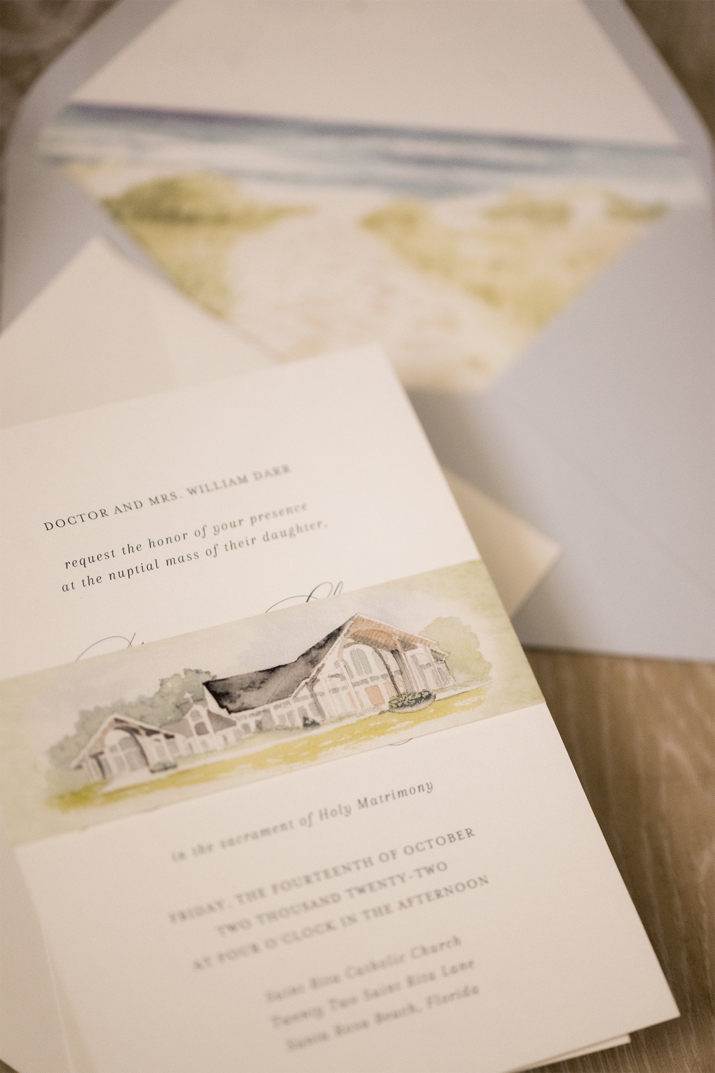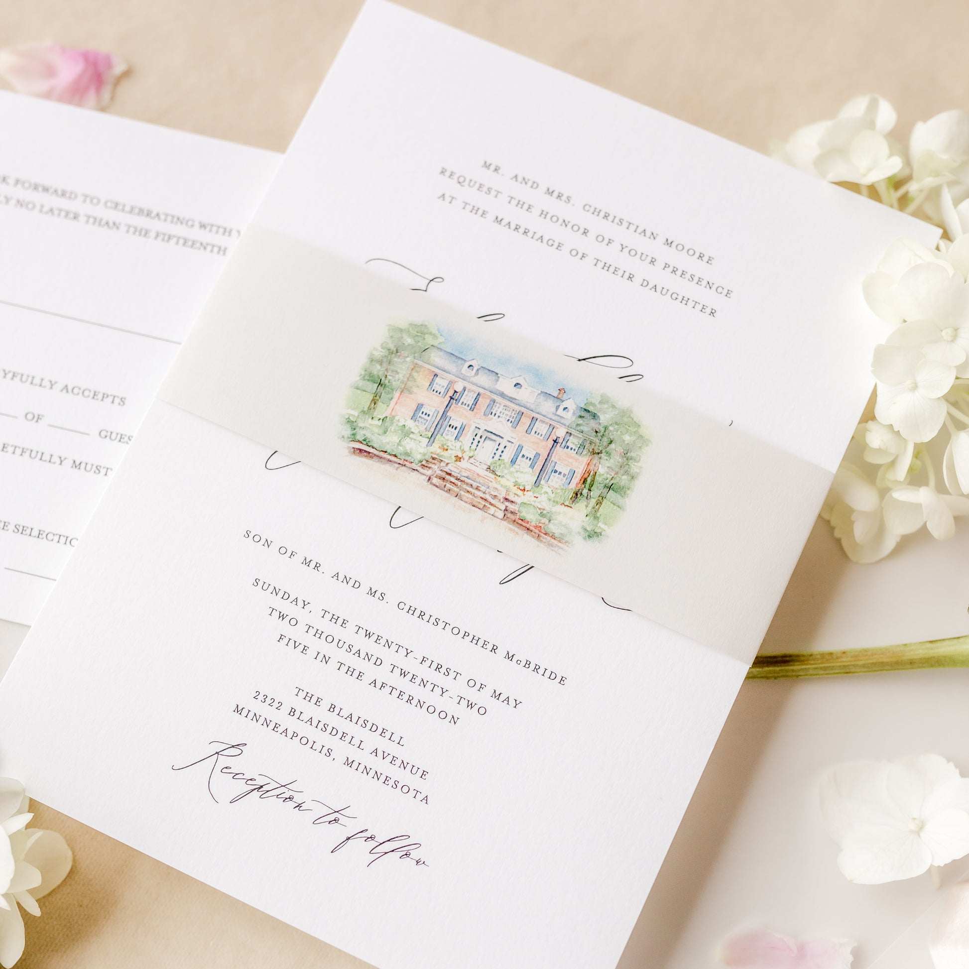 Get your guests excited about where they will be joining you for your wedding by highlighting your venue on belly bands that neatly hold your invitation suite together.