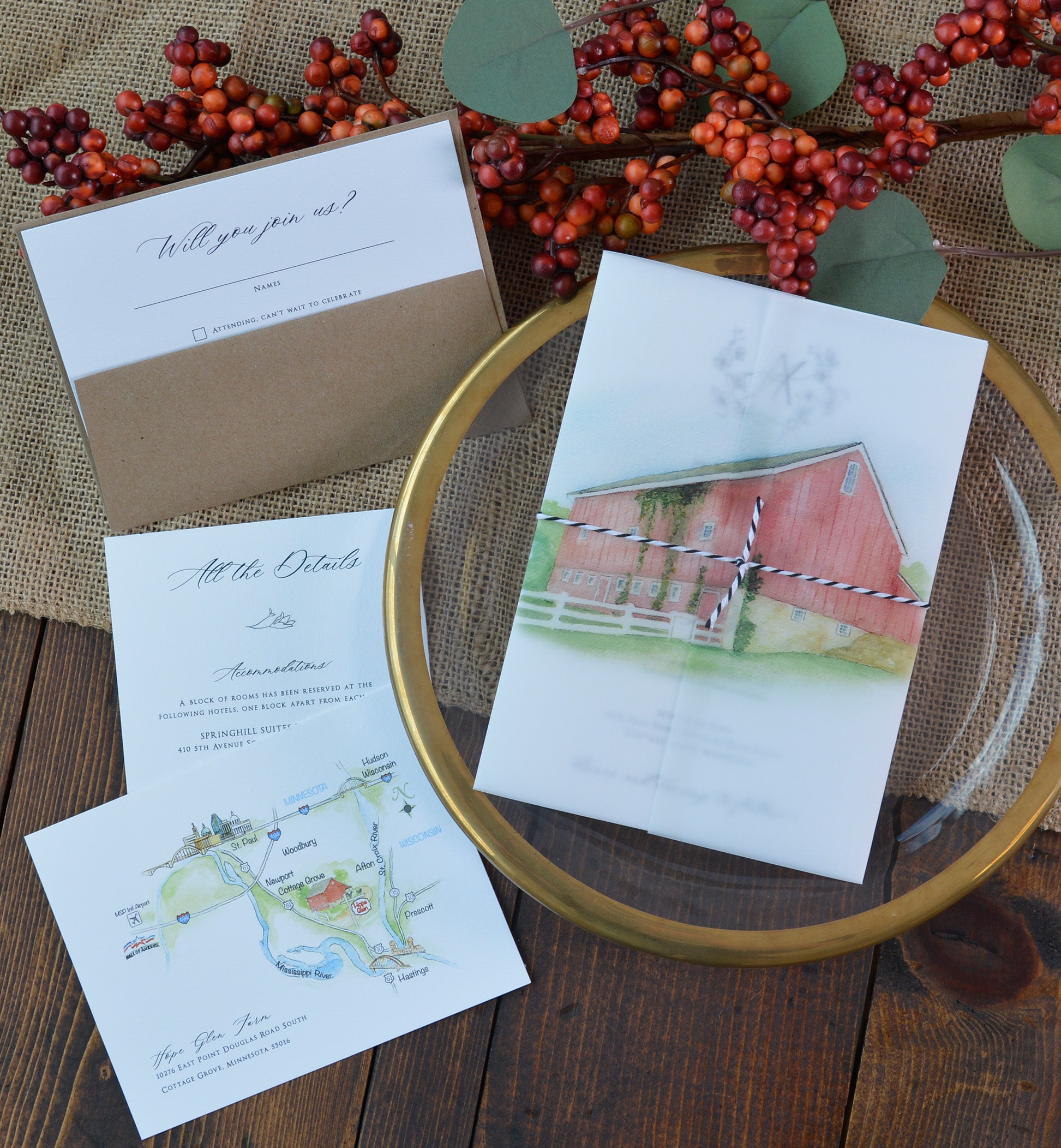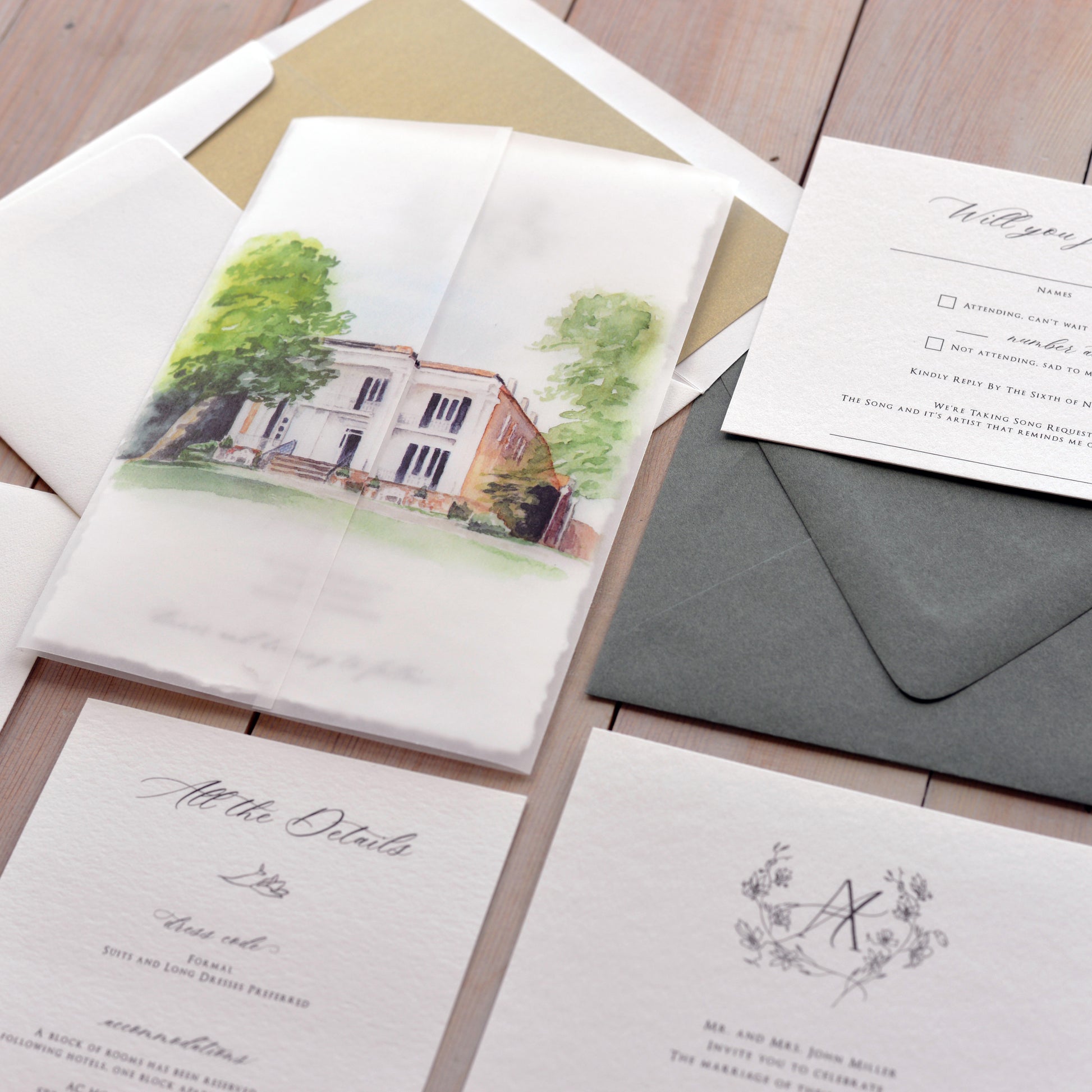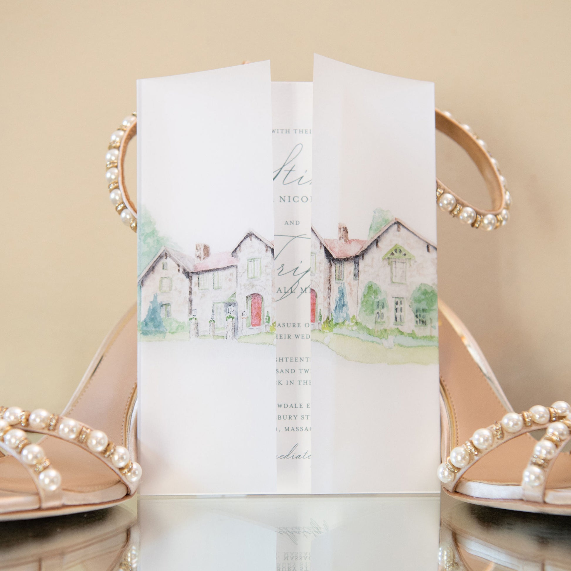 Get your guests excited about where they will be joining you for your wedding by highlighting your venue on beautiful watercolor vellum wraps.