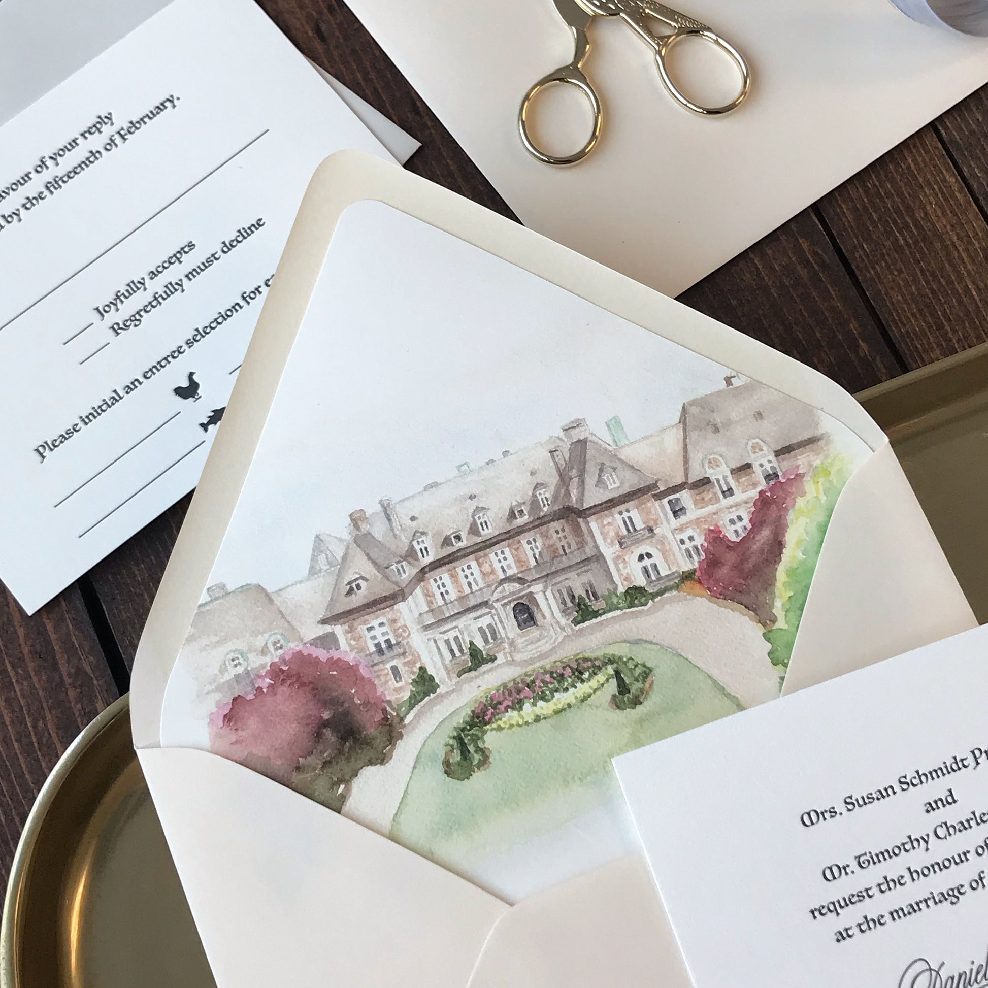 We will paint a custom watercolor painting of your wedding venue based on the elements which are important to you. We'll talk about colors and style before painting to ensure the painting is just as you want it.